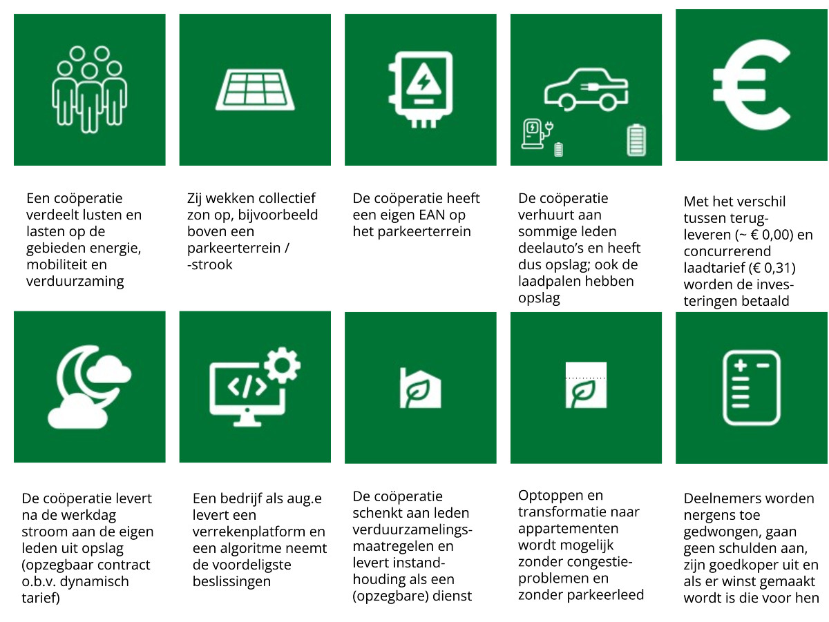 Het verhaal wordt ten slotte compleet als we mensen vragen deelnemer te worden in een buurtcoöperatie. Deze organiseert niets zelf (dat kan beter aan marktpartijen worden overgelaten), maar heeft wel de totale zeggenschap over de laadpalen, de deelauto’s en de afspraken met marktpartijen. Ook levert de coöperatie stroom aan de leden die dat willen, en dat op basis van dynamische prijzen (met behulp van bijvoorbeeld EnergyZero). De coöperatie wekt stroom op met zonnepanelen op daken en boven parkeerplaatsen.