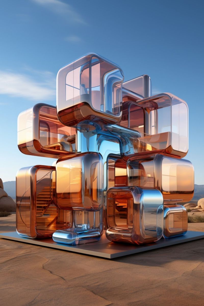 Wat moet de architectuur met dit ‘goedkope’ AI-beeld van een imaginaire fantasiewoning in de woestijn? We hebben bijvoorbeeld niet kunnen achterhalen wat de opdracht was aan de AI-tool waarmee de afbeelding is gefabriceerd. Even denk je aan Piet Bloms kubuswoningen, maar dan zou het wel een héél slimme, dan wel vergezochte vorm van kunstmatige intelligentie moeten zijn. Tot nu toe zijn de interpretaties van AI die we tegenkwamen uit zichzelf nog niet zo creatief.