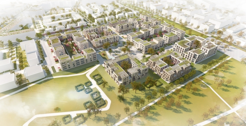Het winnende stedenbouwkundige concept creëert zowel compactheid als diversiteit, reageert op de topografie van het gebied en stelt relatie met de groengebieden centraal. Acht blokken met verschillende afmetingen zijn op eenzelfde dorpse manier gepositioneerd: rondom pleinen, speeltuinen, weiden of ontmoetingsplaatsen. Zowel de binnentuinen als ook de groene gebieden tussen de gebouwen bieden verschillende niveaus van privacy - publiek, collectief of privé. Op drie locaties zorgen open publieke ruimtes voor ontmoetingsplekken in de wijk. Het centrale plein is daarbij zo geplaatst dat men vanaf hier kan genieten van de skyline van Frankfurt. Vanuit het principe van de “open stad” verbindt een fijnmazig netwerk van paden de wijk met zijn omgeving.