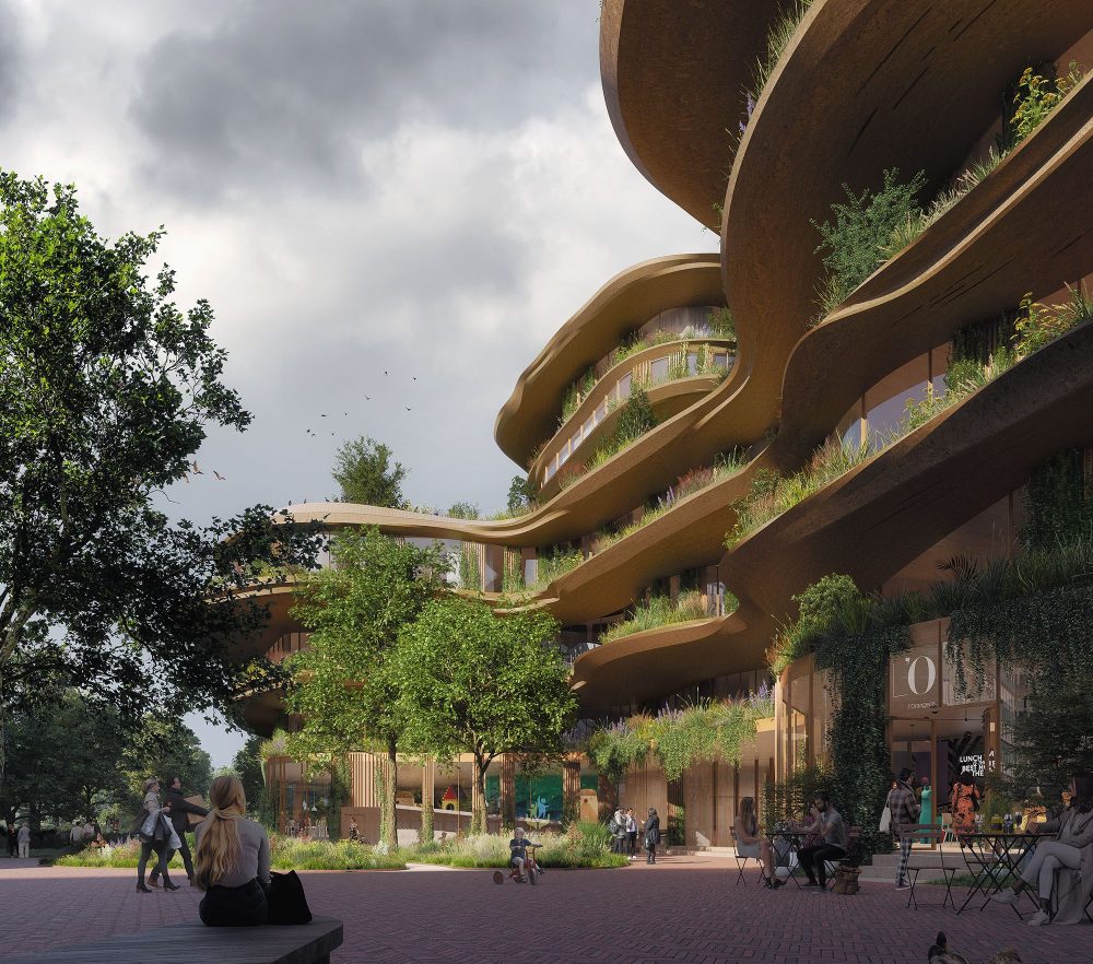 Een ander spraakmakend project waarbij het gelukt is natuur en stedenbouw in balans te brengen is Habitat Royale (foto's boven en onder), een organisch gebouw, ontworpen door een collectief, bestaande uit ontwikkelaar KondorWessels Vastgoed, Mecanoo, Tenderboost, BOOM Landscape en Arup. Het ligt tussen de grootschalige architectuur van de Zuidas, het Beatrixpark en de flanken van de ecocorridors langs station Amsterdam Zuid, die de landschappelijke groene scheggen van Amsterdam verbinden met de stad.
