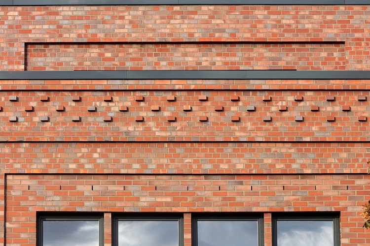 Baksteen als gevelmateriaal was op deze locatie een voor de hand liggende keuze, aldus Arne Bennert van project-s. En de vormgevingsmogelijkheden van het gevelmateriaal konden binnen deze context volop worden benut, stellen Bennert en Rasch: “Onze insteek als ontwerpers was om het gebouw ritme te verlenen en dit ritme in de façades uit te drukken. Onder meer met een verfijnde gelaagde gevelstructuur. Juist in dit gebouw was voor ons van belang dat de baksteen, in samenspel met de verspringingen in de gevels, zijn veelzijdigheid kon tonen. Daarom ook kozen we niet voor een homogene, maar voor een levendig gebrande baksteen, die de nieuwbouw een sterke presentie verleent.“