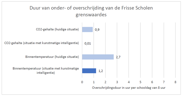 Wanneer de klimaatinstallatie wordt aangestuurd op basis van kunstmatige intelligentie ligt de duur van de overschrijdingen lager, maar er kan niet volledig voorkomen worden dat er nog overschrijdingen zijn. Dit wordt ook weergegeven in het figuur hieronder. Los van een stijging van de kwaliteit van het binnenmilieu, wordt er door gebruik te maken van de kunstmatige intelligentie een reductie in het energieverbruik voor verwarmen van 24 procent gerealiseerd.