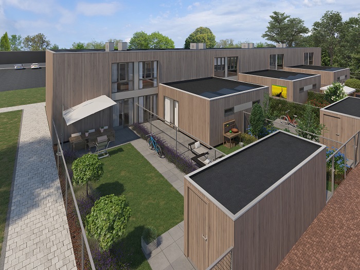 De woningen vormen een bijzonder plaatje in de wijk. Niet alleen vanwege het materiaalgebruik, hout. “We willen woningen realiseren die niet alleen op dit moment een lage CO2-foootprint hebben, maar die we op een later moment kunnen hergebruiken. Dat laatste zien we nog niet zo vaak terug in trajecten met sociale huurwoningen, maar dit sprak ons wel ontzettend aan. Aan de ene kant willen we dat onze bewoners hier een heel leven kunnen doorbrengen, maar aan de andere kant willen we de woningen kunnen demonteren en op een andere plek kunnen neerzetten als de vraag naar woningen anders wordt.” De ambitie om gebouwen ergens anders neer te zetten is een indrukwekkende, passend in een circulaire economie. Daarnaast heeft de corporatie flexibiliteit om op veranderende behoeftes in te spelen. Een voorwaarde bij de creatie van deze gebouwen is het vermijden van natte knopen. De houten woning komt lijmloos uit de fabriek. “De materialen die zijn toegepast kunnen eventueel in andere projecten worden ingezet.”