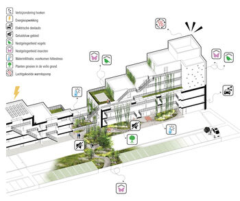Het nieuwe gebouw biedt een woonomgeving met een veelheid aan plekken voor verschillende woon- en leefkwaliteiten. Net als in een vertrouwde buurt liggen de woningen aan een dynamisch plein en een intieme straat, rondom een levendige stadse tuin en boven het café op de hoek met uitzicht over de stad. Ook binnenshuis valt hier te kiezen. Alle woningen van voornamelijk 40-50 m² en hebben een zorgvuldig ontworpen plattegrond met veel indelingsvariatie.