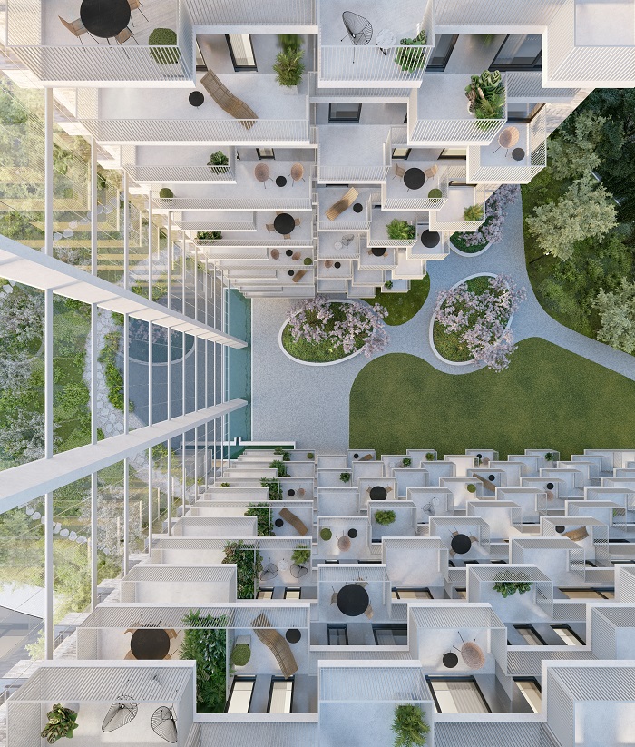 Het woonproject wordt dankzij de opmerkelijke architectuur een nieuwe blikvanger in de Antwerpse skyline. Voor het ontwerp werkte CORES Development samen met POLO Architects. Zij tekenden de twee gebouwen, Louise en Marie, uit die met elkaar zijn verbonden door een glazen scherm. Dit scherm creëert een akoestisch microklimaat in de gemeenschappelijke binnentuin waarvan de bewoners gebruik kunnen maken.