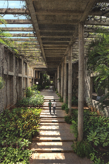 De campus kenmerkt zich door een schakeling van binnentuinen en gebouwen die in harmonie met de natuur een weelderige ervaring oplevert, als je je door de campus beweegt. Het gebouw zelf lijkt daarbij op de achtergrond te verdwijnen. Het in deze tussenruimtes gecreëerde microklimaat zorgt voor passieve koeling van het gebouw én nodigt uit tot willekeurige ontmoetingen en spontaan gebruik door de studenten. Hoewel het plan orthogonaal en rationeel is opgezet, voelt het totaal niet formeel en waan je je, al meanderend door de campus, eerder in een tuin dan in een gebouw.