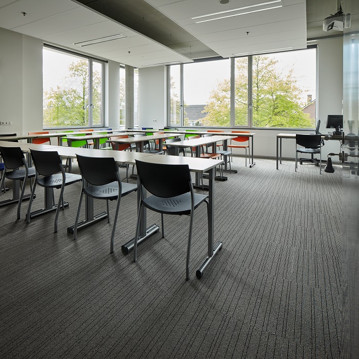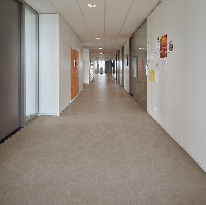 Een product dat hierbij naar voren kwam was het heterogeen vinyl van Tarkett. Zowel bij dagelijks als periodiek onderhoud dient reinigingsgemak hier de mens. Vinyl vloerbekleding van de serie Acczent Excellence 80 is toegepast in zowel hallen als drukbelopen verkeersruimten. De vloerbekleding heeft een hoge slijtweerstand dankzij de TopClean XP oppervlaktebehandeling. Hierdoor is er minder water en reinigingsmiddel nodig om de vloer schoon te houden. De collectie is bovendien vrij van ftalaten en heeft een minimale uitstoot van Vluchtige Organische Stoffen (VOS-emissies) met waarden die tien keer onder de Europese norm liggen. In de lokalen wilde ROC Friese Poort graag zachte vloerbedekking. Hier is gekozen voor de luchtreinigende Airmaster van Desso.