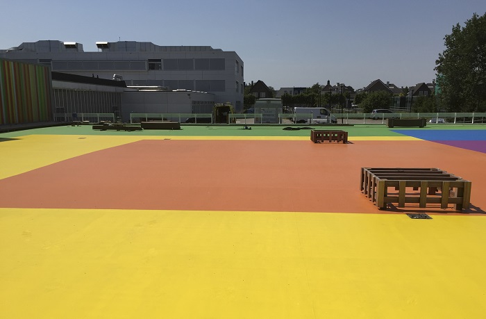 Het centraal gelegen schoolplein dat door de sloop ontstond, is ruim 2.200 m2 groot.Kreeft Betonrenovatie- en Injectietechnieken BV voorziet het hele plein van het Triflex BTS-P systeem. Het vloeibare afdichtingsysteem is speciaal voor dit project in de gewenste kleuren gemengd. Het plein bestaat uit grote overlappende kleurvakken, die perfect overeenkomen met de kleuren op de pleingevels. Het plein is daarmee een ware blikvanger geworden. De keuze voor Triflex was snel gemaakt, vertelt Gortemaker: "Het is het enige product waarmee we de beoogde kleuren konden realiseren en tegelijk goede waterdichtheid kunnen garanderen. Om te voorkomen dat de vloer glad wordt, zijn instrooiingsmaterialen gebruikt. Bovendien is het een slijtvaste oplossing. Dit duurzame effect bereik je niet door het gewoon te schilderen."