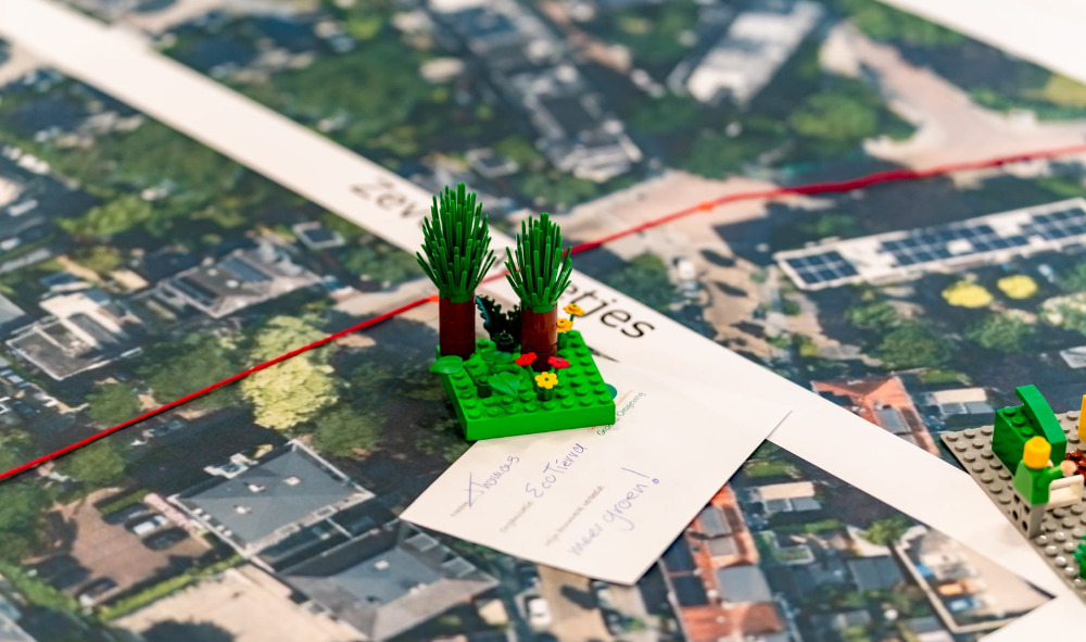 Vier Saxion-studenten begonnen de dag lekker actief met een spel om een fictieve wijk met sociale woningbouw natuurinclusiever te maken. De aanwezigen in de sessie werden verdeeld in vijf groepen van zeven à acht personen, die samen in overleg bepaalden welke maatregelen ter vergroening kunnen worden toegepast. Daarbij kon je punten scoren voor elke gekozen maatregel, van tegeltuin tot waterdoorlatende bestrating. Er gold een maximaal aantal te gebruiken punten van 20.