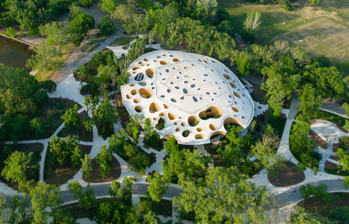 Het fascinerende gebouw ligt verscholen tussen de bomen van het stadspark van Boedapest, waarbij de ontwerpers inspiratie putten uit de combinatie van natuur en geluid. De Hongaarse muziektempel vormt nadrukkelijk een voortzetting van de parkomgeving. Vooral het opvallende, doorschijnende dak zorgt voor een naadloze overgang van binnen- naar buitenruimte.