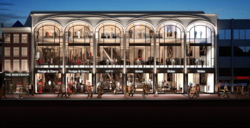 Het nieuwe winkelgebouw krijgt een hoge, transparante gevel met veel glas, dat daglicht tot ver in de grote winkelruimten binnenlaat. De vrije hoogte op de begane grond is 5,10 meter, op de etages 4,80 meter. De grote winkelpuien passen goed in het historisch ontstane beeld van de Nieuwendijk, met 395.000 passanten per week een van de drukste winkelstraten van Nederland. Aan de Gravenstraat – om de hoek – is plek voor één tot twee kleine winkelunits.