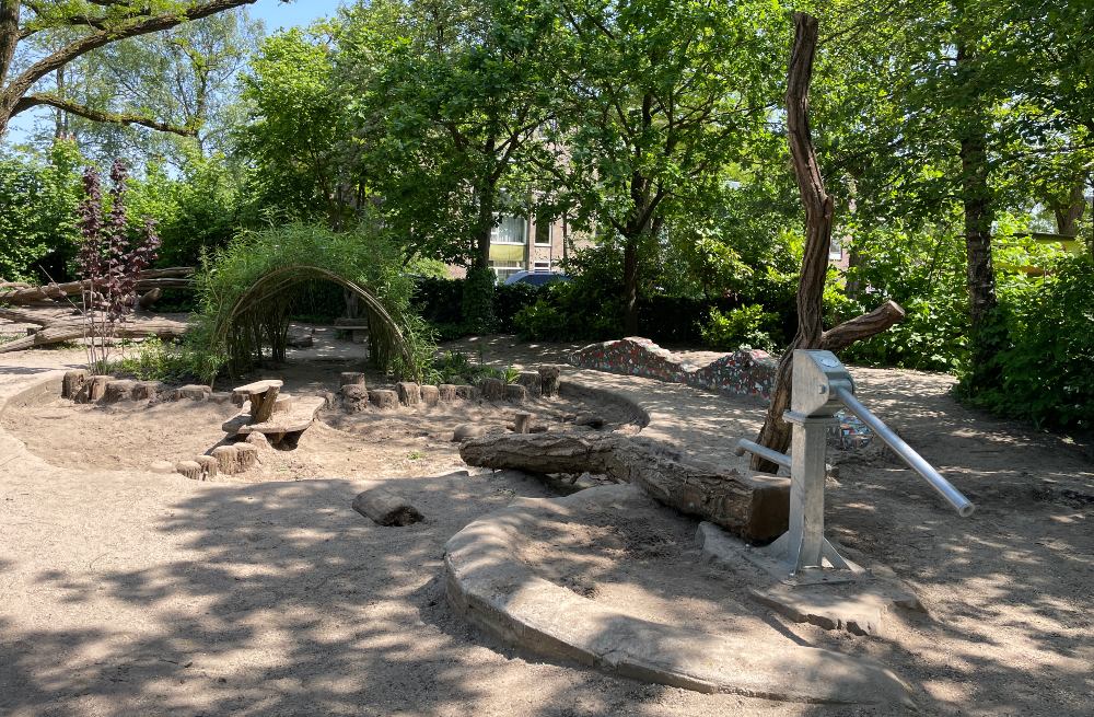 SvG: “Dan denk ik aan OBS Woutertje Pieterse in Leiden. Dat plein ligt er nu een jaar of twaalf en is inmiddels gigantisch groen met enorme bomen. Er zijn plekken waar je de school zelfs niet meer kan zien. Je vergeet even dat je daar op school bent. Dat vind ik een heel mooi gegeven: dat je loskomt van de lessen en echt in de natuur kunt zijn. Er was daar een klein stukje verhard plein met een aantal bomen en een hek eromheen. Er lag ook een grasveld naast, maar pas na de nieuwbouw ging dat bij de school horen. We hebben daar een enorme multifunctionele heuvel met een grote zandbak aangelegd. Die heuvel van bijna drie meter hoog domineert het hele plein en wordt ook gebruikt als amfitheater bij feesten en evenementen van de hele school. Er ligt ook een waterloop met handzwengelpomp, een glijbaan en heel veel groen tegenaan. Bovenop is er ruimte voor een buitenklas en verder zijn er veel paadjes waar de kinderen doorheen kunnen struinen. Eronder zit nog een zeecontainer met tuingereedschap. Ouders zorgen voor een groot deel voor het onderhoud.”