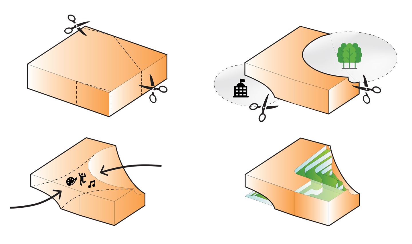 De verkeersstromen van de verschillende groepen leerlingen zijn slim gescheiden door onder meer een splitsing van de entree. Volgens het beoordelingsteam voelt de ingang ‘organisch, open en verwelkomend’. Hoewel elke leeftijdscategorie een eigen ingang en plek krijgt, speelt verbinding van verschillende culturen een belangrijke rol in het ontwerp. In het hart van het gebouw komen het auditorium en een centraal binnenplein met muziekstudio’s als verbindende factor. Je hoeft elkaars taal niet per se te spreken; hier leer je elkaar spelenderwijs kennen door muziek, dans en theater.