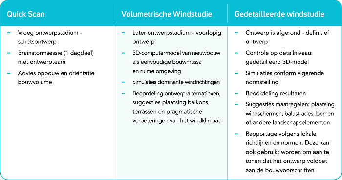 De middelen die Actiflow inzet voor de advisering ten aanzien van wind zijn sterk afhankelijk van de fase van het ontwerpproces en hiermee het beschikbare budget enerzijds en de aard van de adviezen anderzijds. In een vroeg ontwerpstadium zijn de onzekerheden groot en dienen de adviezen gericht te zijn op de grote lijnen, bijvoorbeeld de volumetrie en oriëntatie. In latere ontwerpfasen is er meer duidelijkheid over het ontwerp en is informatie benodigd op detailniveau, bijvoorbeeld ten aanzien vanentreegebieden, balkons en (dak)terrassen. Onze producten sluiten hierop aan: