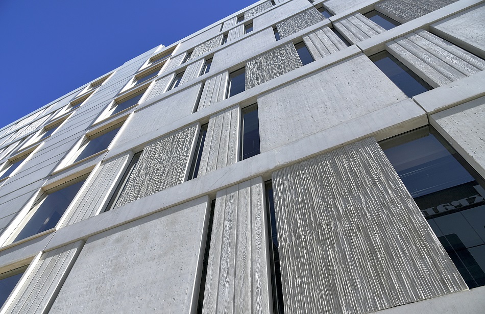De gevelelementen tussen de betonvloeren hebben vier verschillende bewerkingen. Zij vormen een mozaïek met tegenstellingen tussen open en gesloten, ruw en glad, dof en glanzend en breed en smal. Het gevarieerde ritme van de wisselende dilataties creëert in het donker een opmerkelijk lichtspel. Accenten als de houten verticale lamellen en geperforeerde staalplaat bij de entrees geven het gebouw een extra gelaagdheid.