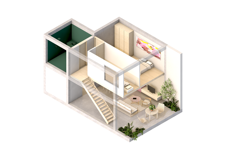 Render van het interieur van Superlofts. Render door Marc Koehler Architects