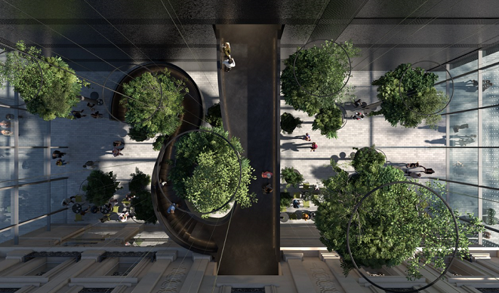 Een van de hoogtepunten van het ontwerp is de toevoeging van een grote centrale wenteltrap aan de pleinzijde. Deze refereert met een knipoog naar het allereerste negentiende-eeuwse ontwerp. De trap heeft ook daadwerkelijk een functie en biedt toegang tot de eerste verdieping. Binnenin bevindt zich een tweede wenteltrap die de route vanaf de nieuwe ingang aan de Place de Republique zal verbinden met de tweede verdieping.