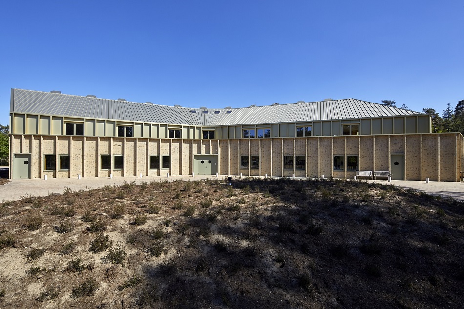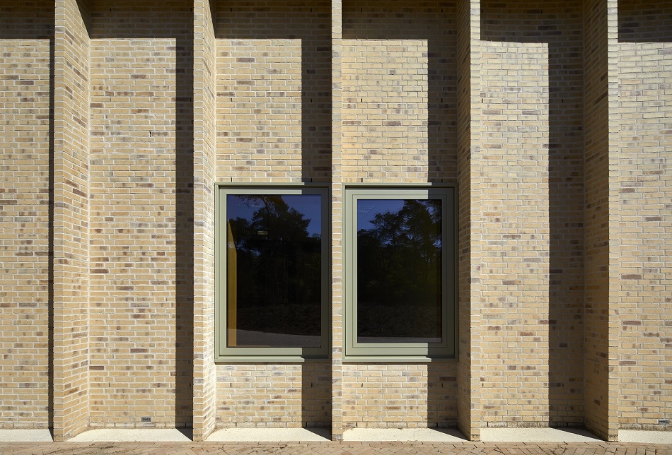 In het exterieur sluit het Park Paviljoen aan op het kleurenpalet van de omgeving – het zand en de heide van Het Nationale Park De Hoge Veluwe. MONADNOCK en De Zwarte Hond kozen hier voor een combinatie van champagnekleurig aluminium en de zandgele Hagemeistersortering Kopenhagen GT+FU. Floris: "We wilden aan de baksteengevels geen vervuiling, een risico bij bouwen in een bosrijke omgeving. Tegelijkertijd wilden we ook geen al te abstracte metselvelden. Dat bracht ons bij de Kopenhagen: een harde, bestendige en duurzame maar ook genuanceerde steen, met een zandgele basiskleur, roodbruine en roze accenten en gedeeltelijk gesinterd." De gemetselde gevels kregen een geborstelde platvolle voeg. Floris: "Die brengt het metselwerk dichter bij elkaar en legt het accent meer op het vlak dan op de individuele steen."