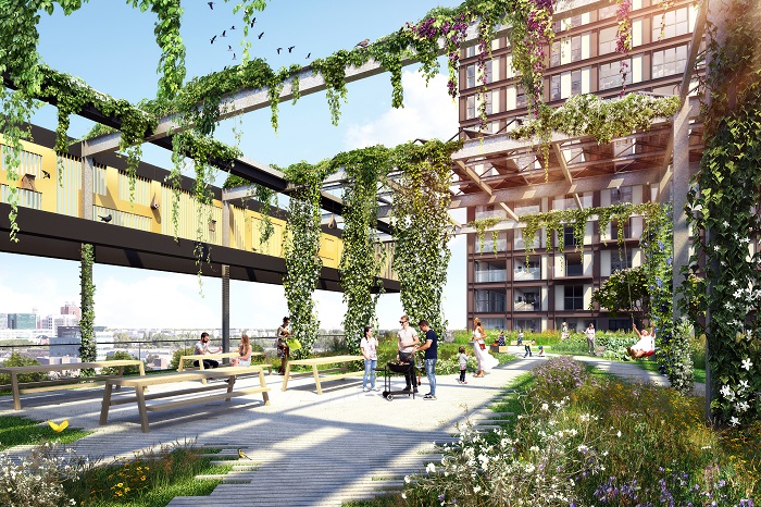 Boven de levendige plint is het gebouw in de bovenste lagen geheel geprogrammeerd als parkeergarage. De hoogte van de stedelijke laag sluit een bij kavel 1A en 1C en geeft een herkenbare en uniforme uitstraling van kavel 1. Het dak van de parkeergarage is ingevuld met een daktuin die door de bewoners van de woontorens kan worden gebruikt. Hierop komt een pergolaconstructie die fungeert als energiedak en in samenspraak met bewoners kan worden ingevuld met speeltoestellen, zitelementen, hangmatten en groengeleiders.