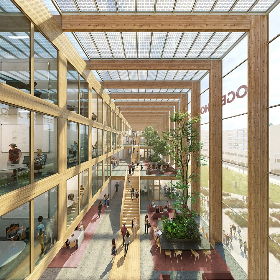 In het ontwerp staan openheid en verbinding centraal. Het gebouw valt op door een groot trapsgewijs oplopend glazen atrium met een robuuste houtconstructie aan de noordgevel en de monumentale hoofdentree. Paul de Ruiter: “De houten trappen liggen direct aan de glazen gevel van het atrium en verbinden de verschillende verdiepingen en studiepleinen van het gebouw. Het transparante karakter van het gebouw haalt de buitenwereld binnen en brengt de binnenwereld naar buiten.”