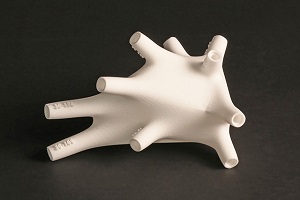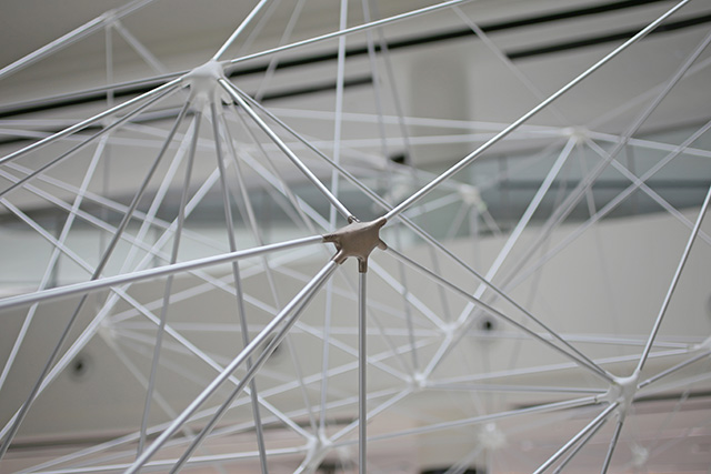 In plaats van een geschaald model te 3D-printen is voor het paviljoen, een maas van aluminium, nylon en staal, de technologie direct toegepast op de architectonische componenten op grote schaal. Iedere knoop (19 van metaal, 72 van nylon) is apart ontworpen op basis van hun geometrische posities, afhankelijk van het aantal staven die erin samenkomen.