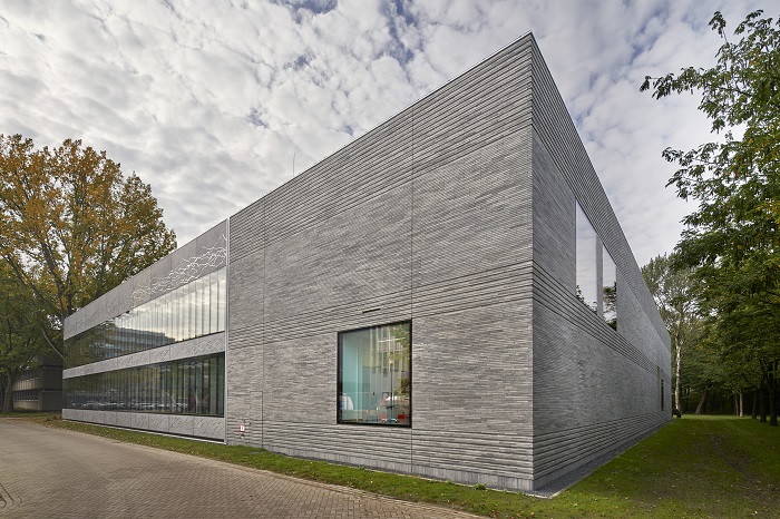 Belangrijk was om meer daglicht in het gebouw te krijgen, vandaar grote glaskozijnen in de gevel. Maar de horizontale geleding is gebleven, mede omdat de omliggende gebouwen ook die structuur hebben. De betonpanelen strekken zich in twee horizontale banen over het gebouw uit, waarbij die banen doorlopen in de gevels die met 3 cm dunne grijsblauwe betonnen gevelsteenstrips van MBI zijn voorzien. Op de dikke betonmuren is isolatie aangebracht en daarop zijn deze steenstrips geplakt. Ter hoogte van de meanderende stromen is dat met een dieptereliëf gedaan. Zo zie je de tektoniek van de gevel in deze banen rond het hele gebouw doorlopen. Met deze constructie van isolatie en stenen op de betonwand kwam dit geveldeel ook mooi in één vlak te liggen met de façade met de betonelementen.