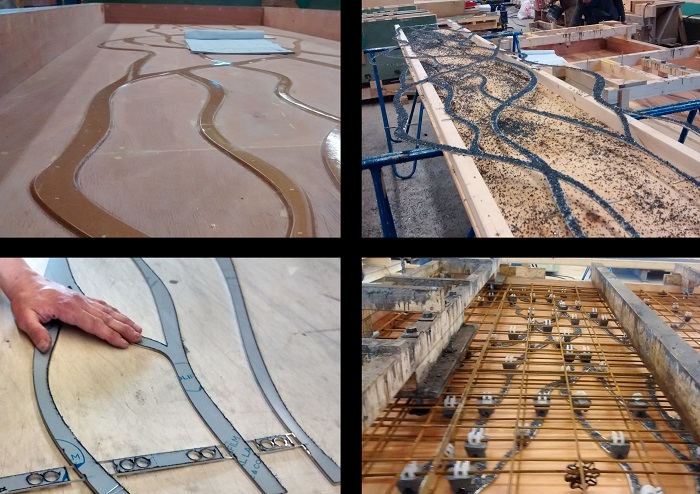 Van de Venne vervolgt:“We hebben om reden van productiecapaciteit en ervaring met betonspecials toen gekozen voor Veluwe Beton.Hier zijn in totaal ruim 120 gevelelementen vervaardigd. Daarbij praat je over strips van 3 mm dikte in betonelementen van 15 cm dikte. Met de hand zijn de strips in de mallen aangebracht. Het was voor een deel ambachtelijk werk, gecombineerd met moderne productietechnieken. We hebben vier mallen met verschillende patronen van meanderende rivieren gemaakt, die in de gevel in wisselende combinaties zijn geplaatst. Zo krijg je dat beeld van een onregelmatige rivierendelta. In het betonoppervlak is een zweempje blauw aangebracht- verwijzend naar water - op basis van een natuurlijke kleurstof.Het is ook mooi om te zien hoe door de lichtinval en schittering het daadwerkelijk lijkt of het water door de meanderende rivieren stroomt.”