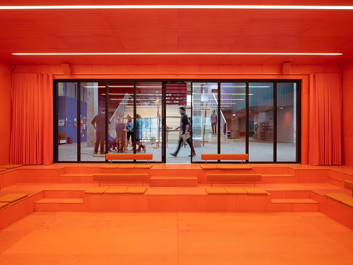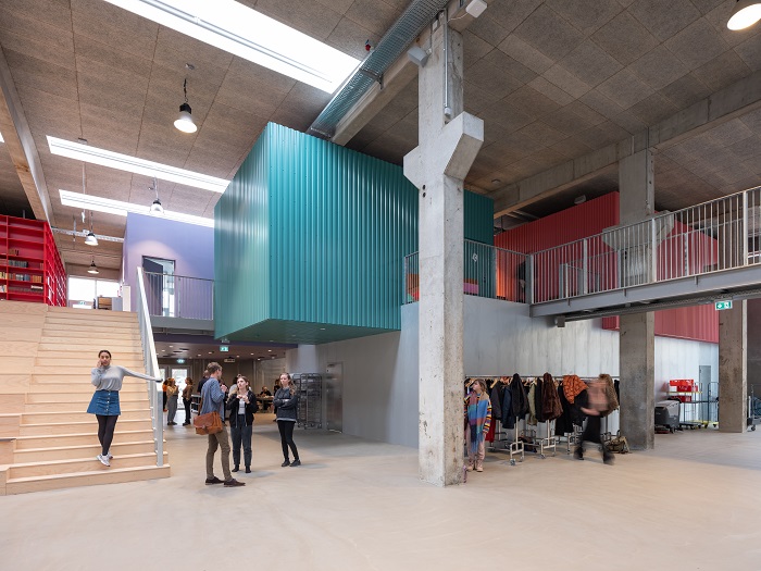 In het midden is een houten tribune toegevoegd waar studenten elkaar kunnen ontmoeten en die daarnaast een perfecte plek is voor presentaties. Op de eerste verdieping zijn de lerarenkamer, de danszaal een bibliotheek en verschillende studio's gevestigd.