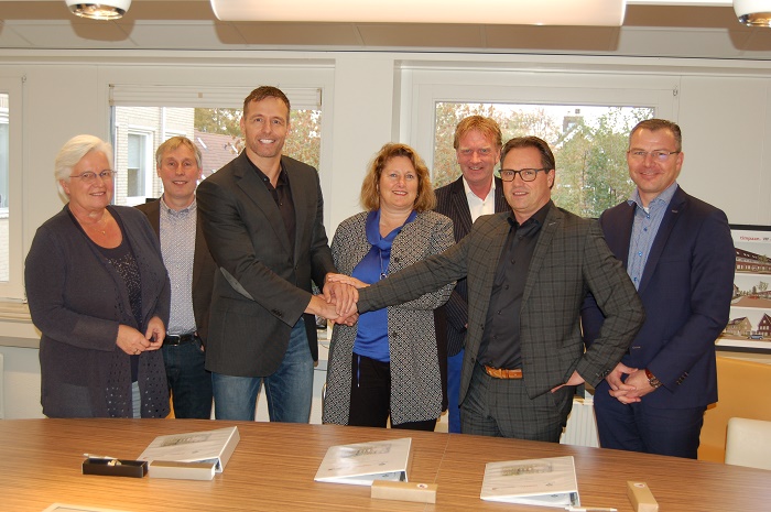 Timpaan, Van Rhijn Bouw en gemeente Teylingen schudden elkaar de hand na de ondertekende overeenkomst.