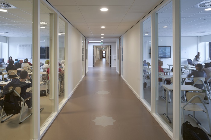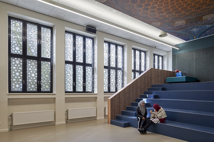 De rondgang op de begane grond heeft een duidelijke routing, ondersteund door 8-puntige sterren ter hoogte van de belangrijke plekken. Op de vloer van de aula staat een afbeelding van de Rotterdamse Maas. Foto’s van diverse Arabische landen decoreren het plafond. In het hele ontwerp zijn arabeske elementen gecombineerd met de bestaande architectuur zoals het schoonmetselwerk en originele plastieken. De debatruimte, met een levensechte foto van het plafond van de Sheikh Lotfollah moskee, kan gerust spectaculair genoemd worden. Dat geldt overigens ook voor de entree, waarin de originele trap behouden is.