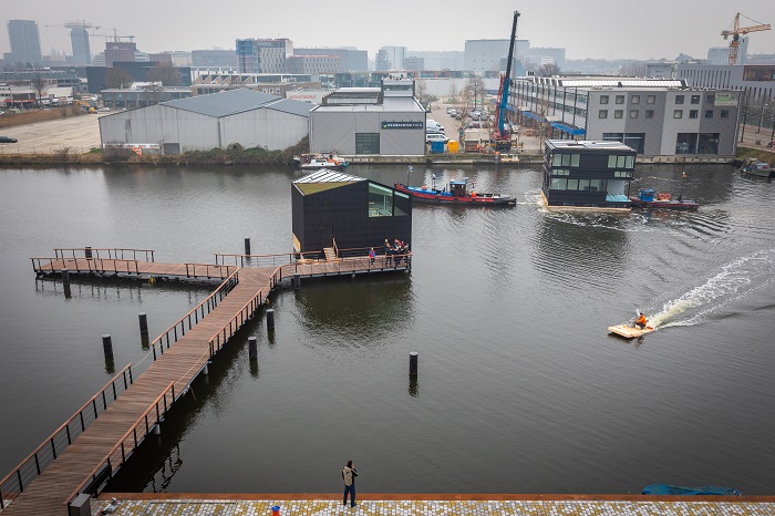De geschikte plek werd gevonden aan een zijtak van het IJ, het Johan van Hasseltkanaal. Maar dat was slechts de eerste fase. “Volgens bestemmingsplan zat er al een woonfunctie op. Er moest nog wel het een en ander gebeuren om werkelijk een vergunning te kunnen krijgen voor een woongebouw. We vroegen bij de provincie Noord-Holland subsidie aan voor een haalbaarheidsstudie.” Daarna werd Sascha Glasl van Space & Matter erbij betrokken. Hij maakte het stedenbouwkundige plan. “Midden in de crisis gingen we met dat plan naar de gemeente Amsterdam.”