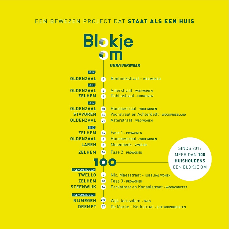 Een overzicht van alle Blokje Om projecten waarmee de 100e woning bereikt kon worden, inclusief een doorkijk naar de aankomende projecten.