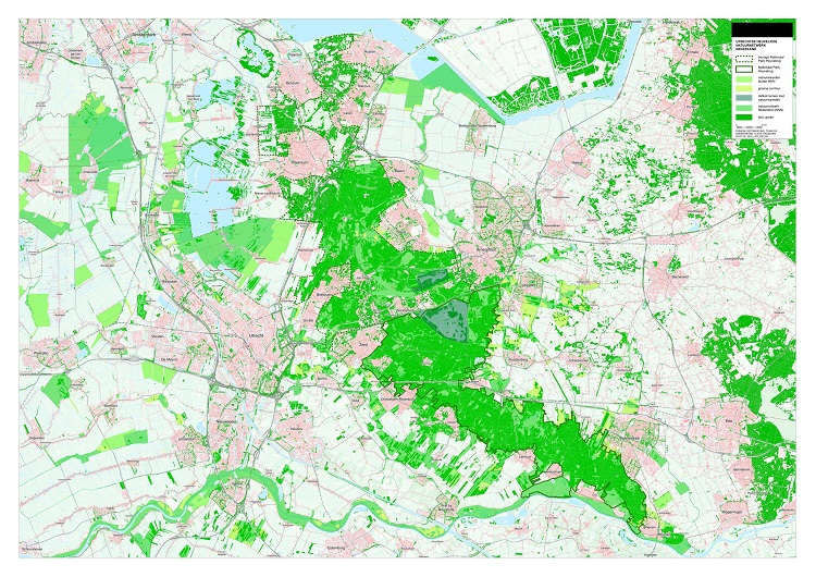 Het Nationaal Park Utrechtse Heuvelrug ten opzichte van het stedelijk gebied. Kaart door Provincie Utrecht.