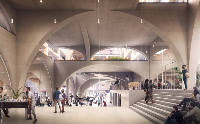 Deze ‘superruimte’ is 65 bij 50 meter en is 8,5 meter hoog met een constructie van bogen. Dit houdt het vloeroppervlak vrij en creëert intieme ruimtes. Zo kan er afwisselend worden omgegaan met de ruimte, van werkplekken en horeca tot voorstellingen en concerten.