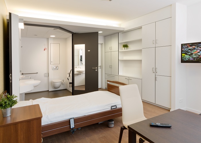 Een oplossing die tot nog toe vooral in zorggebouwen wordt toegepast, onder andere bij WZU Veluwe. Daar waar van kleine zorgappartementen zelfstandige woningen worden gemaakt, biedt de flexibele wand met wastafel uitkomst. De badkamer kan met minder vierkante meters toch goed bruikbaar zijn voor iemand die in een rolstoel zit of geholpen moet worden. En het ziet er nog mooi uit ook.