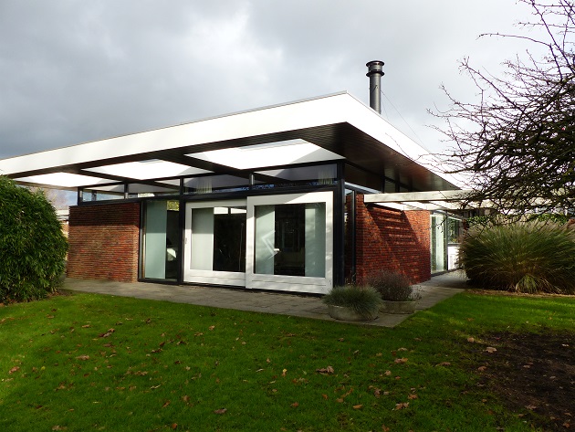 Op een uitgesproken zichtlocatie liet de bouwondernemer P. de Jong een ruim opgezette bungalow realiseren naar een plan van Abe Bonnema. De tuin is aangelegd naar een ontwerp van Mien Ruys. Het huis is gebouwd in een Nieuw Zakelijke, modernistische trant. Kenmerkend voor het huis is de geslotenheid aan de straatzijde en het open karakter aan de achterzijde, waar binnen en buiten organisch in elkaar overgaan. De buitengevels bestaan uit gemetselde ‘schijven’ gemêleerde roodbruine baksteen, afgewisseld met grote rechthoekige vensterpartijen tot op de grond. Rondom liggen lichtstroken op de muren, waardoor het fors overstekende maar met grote openingen geperforeerde platte dak lijkt te zweven.