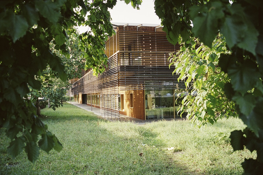 Studeren in een gebouw waarin je letterlijk omgeven bent door groen, ook op de verdiepingen. Lacaton & Vassal ontwierpen dit gebouw met een dubbele gevel waarin planten groeien. De gevel filtert het licht, maakt natuurlijke ventilatie ook op grotere hoogte mogelijk, verrijkt het vergezicht en biedt tevens een mogelijkheid tot het wassen van de ramen. Binnen maar toch buiten.