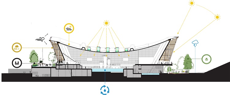 Het nieuwe zwemstadion wordt gebouwd in hout, met een indrukwekkend houten dak dat als een zwevende vorm perfect zicht geeft op de wedstrijdbaden. Door deze dakvorm blijft het energiegebruik beperkt. Ook op alle andere vlakken overstijgt het plan de duurzaamheidsrichtlijnen. Zo is het dak volledig voorzien van zonnecellen en daarmee één van de grootste ‘solar farms’ in Frankrijk. Rondom het compacte gebouw is ruimte om honderd nieuwe bomen te planten.