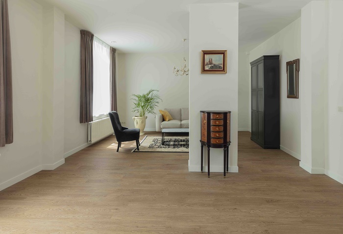 Op de vloer ligt net als in alle andere Stepping Stones huizen wel een Allura pvc-strokenvloer van Forbo Flooring. In totaal maar liefst zo’n 2000 vierkanter meter. Volgens Merison geeft Allura een chique en huiselijke uitstraling, maar wel met relatief lage onderhouds- en schoonmaakkosten en bovendien een lange levensduur.