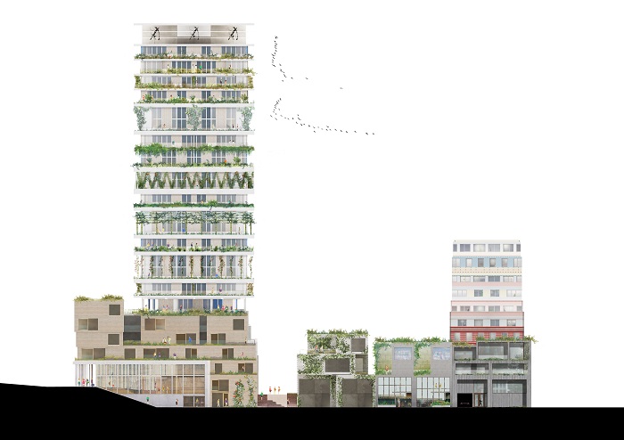 Kamiel Klaasse en Walter van Dijk, van NL Architects, werken in opdracht van Heijmans Vastgoed bv, samen met Studio Donna van Milligen Bielke, Space Encounters en Chris Collaris, (en DS Landschapsarchitecten en De Dakdokters voor het ontwerp van de buitenruimten en de beplantingstrategie) aan Vertical, een complex van 144 woonunits, variërend in hoogtes (3-4-6 meter) en in vloeroppervlaktes (50 tot 220 vierkante meter), verdeeld over hoogbouw (twee woontorens) en laagbouw, met een ondergrondse parkeergarage voor 72 auto’s (inclusief 2 elektrische deelauto’s), en een inpandige fietsenstalling achter een glazen gevel (capaciteit voor 560 fietsen), en een plint met functies gericht op buurt en bewoners. BVO van het gehele complex is circa 25.000 vierkante meter.