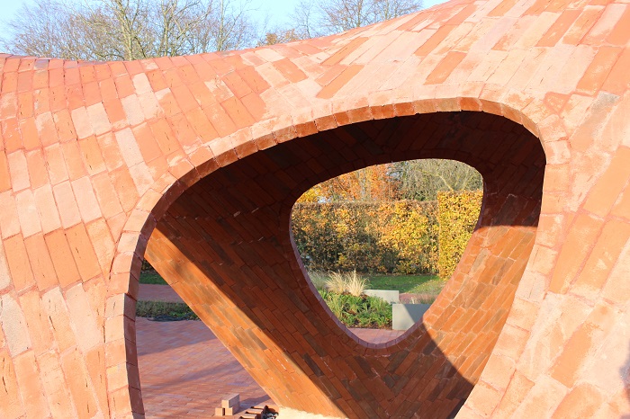 In het paviljoen van Hagemeister zorgen juist de steenstrips voor een heel andere oppervlaktesfeer en beleving, stelt Kleppe: "Spannend is dat het een traditioneel gewelf is, met de charme van de handformaat steen, maar met die geringe dikte. En: beton verweert, de baksteen niet."