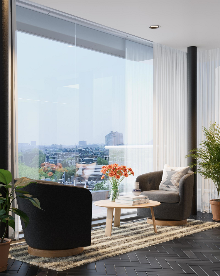 De nieuwste vestiging van WeWork in Amsterdam bestaat uit verschillende lounges, vergaderruimtes, flexibele hot desks en privékantoren. De evenementen- en vergaderruimte op de achtste verdieping biedt een bijzonder 360-graden uitzicht over heel Amsterdam. Het interieur is aangekleed met hedendaagse kunstwerken die voornamelijk geïnspireerd zijn op de tradities van de stad. Daarnaast zijn er ook veel unieke stukken in eigen huis ontworpen die de cultuur en traditie van Nederland weerspiegelen.