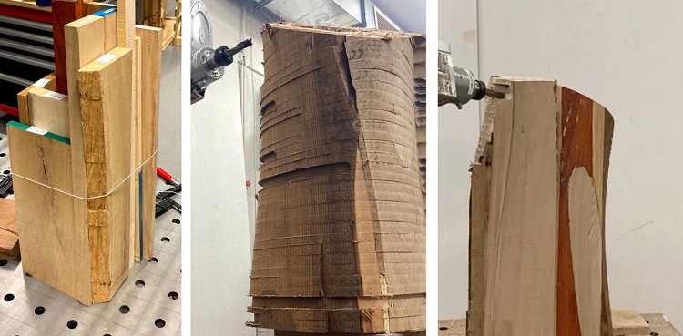 In een ander, meer recent project werd robot frezen en 3D printen gecombineerd met principes van circulaire economie in samenwerking met de Hogeschool van Amsterdam (HVA), waarbij circulaire hout wordt gebruikt en geen enkel deel van het materiaal verloren gaat. “We optimaliseerden een gehele structuur en produceerden daar een fragment van”, aldus Bier. “Daarvoor gebruikten we hout van oude gebouwen. We lijmden delen aan elkaar vast en freesden deze robotisch. De combinatie van materialen creëerde niet alleen interessante patronen, ook al het hout werd gebruikt. Aan de ene kant hadden we het gefreesde houten fragment, terwijl de overblijfselen als printmateriaal werd gebruikt.”