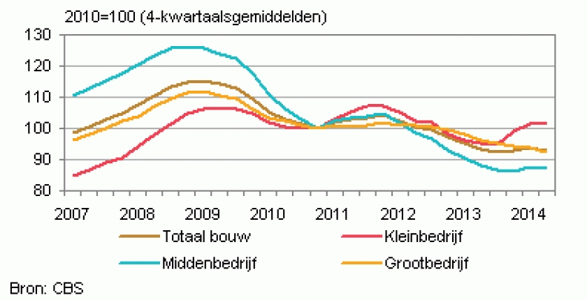 De bouw laat in het tweede kwartaal een omzetdaling zien van 2,4 procent vergeleken met het tweede kwartaal van 2013. Deze daling vond plaats in alle bouwbranches: de burgerlijke en utiliteitsbouw, de grond-, weg- en waterbouw, de gespecialiseerde bouw, en in het midden- en grootbedrijf. De omzet in het middenbedrijf in de burgerlijke en utiliteitsbouw daalde in het tweede kwartaal met 3,7 procent tot slechts 59 procent van het omzetniveau in hetzelfde kwartaal in het topjaar 2008.
