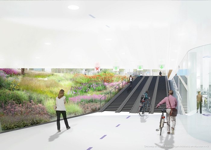 De fietsenstalling is ontworpen als een stedelijk souterrain waarbij een ruime opzet, overzicht en overvloedig licht orgen voor optimale functionaliteit, comfort en veiligheid. Daglicht en natuurlijke groenvlakken reiken tot diep in het souterrain. Aanwezige lamp-armaturen gaan pas branden wanneer het buiten te donker is.