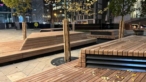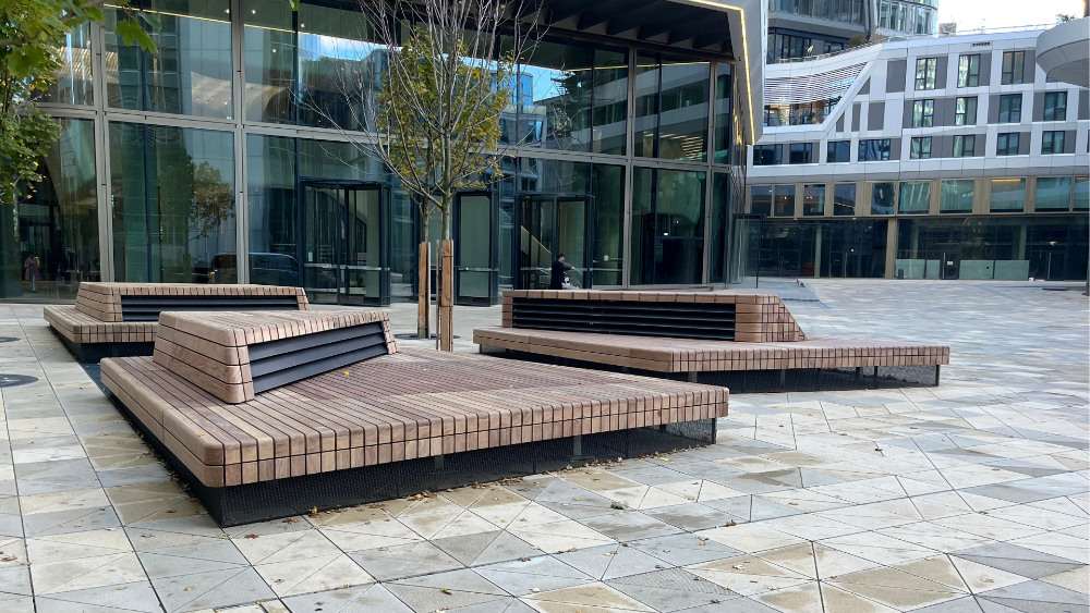 - Zitelementen op maat, geïnspireerd op de eigen serie PLANE SOLID. Deze vormen samen met de architectuur een harmonisch geheel. De zitelementen zijn uitgevoerd met roosters, zodat luchtventilatie vanuit de onderliggende parkeergarages gegarandeerd is. Zo blijven functionaliteit en comfort behouden, ook in een complexe stedelijke setting met ondergrondse garages.